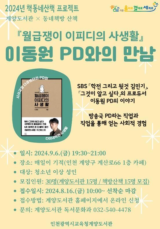 '이동원 PD와의 만남'은 ‘2024년 책동네산책 프로젝트’ 사업의 일환으로 계양구의 지역서점 ‘동네책방 산책’과 협력해 지역사회 읽걷쓰 문화 확산을 위해 진행한다.