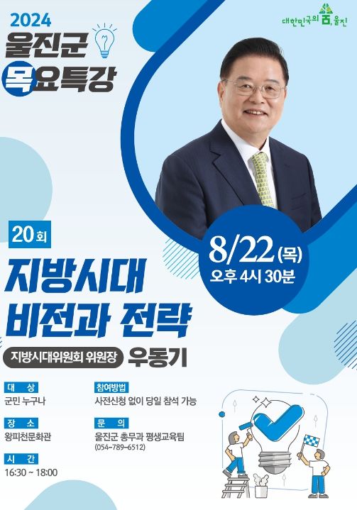 (아름다운교육신문) 울진군은 오는 22일 울진왕피천공원 내 왕피천문화관에서 우동기 지방시대위원회 위원장을 초청하여‘지방시대 비전과 전략’이라는 주제로 제20회 목요특강을 개최한다.