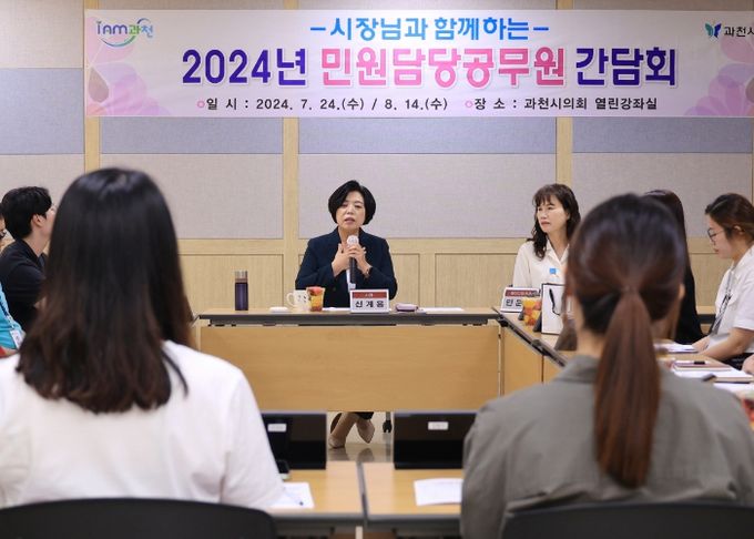 (아름다운교육신문) 신계용 과천시장은 지난 14일, 과천시의회 열린강좌실에서 민원 담당 공무원과 간담회를 열어 직원들의 업무상 애로사항을 듣고 민원 현안을 논의하는 시간을 가졌다.