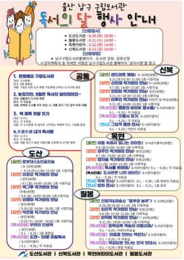 (아름다운교육신문) 울산 남구 구립도서관이‘9월 독서의 달’을 맞아 지역주민들의 문화욕구 충족과 책 읽기 문화가 지속적으로 확산될 수 있도록 풍성한 독서문화 행사를 개최한다.