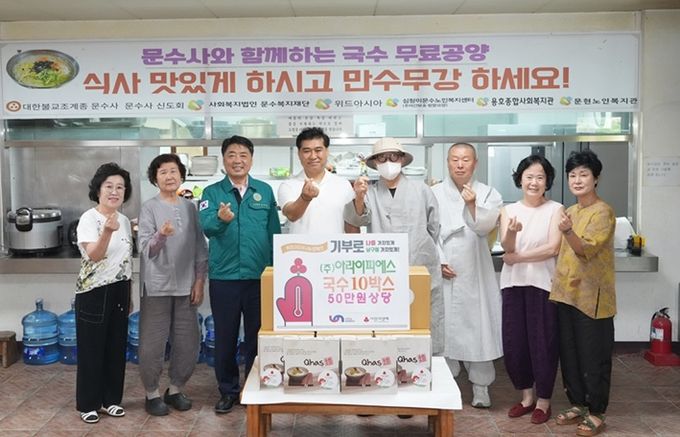 (아름다운교육신문) 지난 14일 부산 남구 용당동 문수사(주지 지원 스님)에서 열린 국수 무료 공양 행사에 ㈜아라이피에스 박창희 대표가 50만원 상당의 국수 10박스를 후원하며 지역 사회에 따뜻한 나눔을 실천했다.