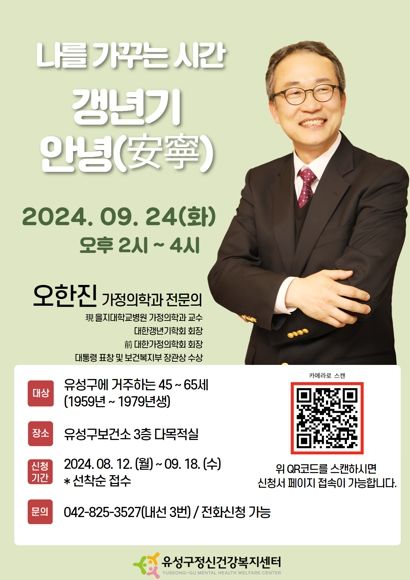 강연은 9월 24일 유성구보건소 다목적실에서 열릴 예정이며, KBS'비타민', MBN'엄지의 제왕' 등 다수의 건강프로그램에 출연한 오한진 을지대학교병원 가정의학과 교수를 초청하여 “나를 가꾸는 시간 갱년기 안녕(安寧)”을 주제로 ▲갱년기 주요증상 ▲스트레스 관리법 ▲식단관리 등 갱년기 건강관리를 위한 내용을 다룰 예정이다.
