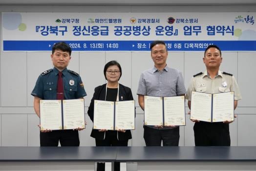 (아름다운교육신문) 서울 강북구는 지난 13일 강북구청 다목적회의실에서 정신응급 공공병상을 운영하기 위해 마인드웰병원, 강북경찰서, 강북소방서와 협약을 체결했다.