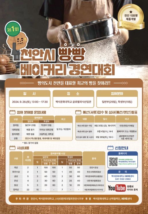 최우수 일반부(50만 원)·학생부(40만 원) 등 수상자에게는 총 600만 원의 상금을 수여하고, 수상작은 ‘2024 빵빵데이 천안 축제’에 전시된다.