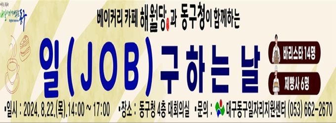 다(多)잡(Job)데이는 인력 채용이 필요한 기업체와 구직 희망자가 직접 만나 면접과 채용이 이뤄지는 행사로, 대구 동구 일자리지원센터는 지난 7월, ㈜해월당 베이커리·카페와 제빵사, 바리스타 등 총 20명을 채용하기로 협의했다.