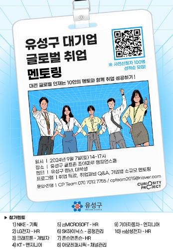 (아름다운교육신문) 대전 유성구는 오는 9월 7일 골프존조이마루 챔피언스홀에서 청년들의 취업 성공을 위해 대기업 전·현직자 10명으로 구성된 멘토단과 함께 하는 맞춤형 직무 멘토링 콘서트를 개최한다고 전했다.