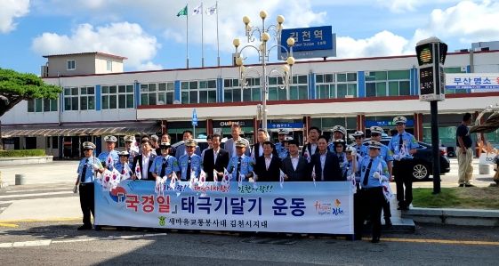 이날 김천역에서 펼쳐진 캠페인에는 김충섭 시장, 나영민 시의장을 비롯한 여러 시의원과 이우청 도의원이 함께 참석해, 택시와 오가는 차량에 일일이 태극기를 달아주고 일부 시민에게는 손태극기를 나눠주는 등, 광복절과 그날의 의미를 잊지 말고 국경일 태극기 달기를 당부했으며, 무더운 날씨에도 열정적으로 활동하고 있는 교통봉사대원들을 격려했다.