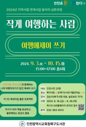 (아름다운교육신문) 인천광역시교육청북구도서관은 읽걷쓰 사업의 일환으로 독서문화활동 확산을 위해 인천시민을 대상으로 지역서점과 함께하는 글쓰기 동아리 ‘작게 여행하는 사람’을 운영한다.