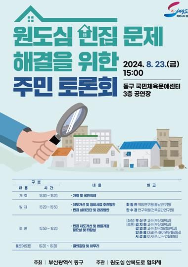 (아름다운교육신문) 부산 동구는 부산 동구‧원도심 산복도로 협의체(중구 서구 동구 영도구 부산진구) 주최‧주관으로 8월 23일 오후 3시, 동구 국민문예체육센터 3층 공연장에서 “원도심 빈집 문제 해결을 위한 주민 토론회”를 개최한다고 밝혔다.