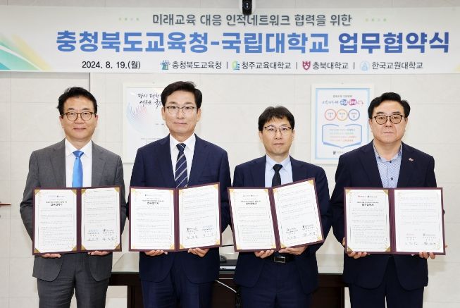 (아름다운교육신문) 충청북도교육청은 19일, 본청 회의실에서 청주교육대학교, 충북대학교, 한국교원대학교와 미래교육 대응 인적네트워크 협력을 위한 업무협약을 체결했다.