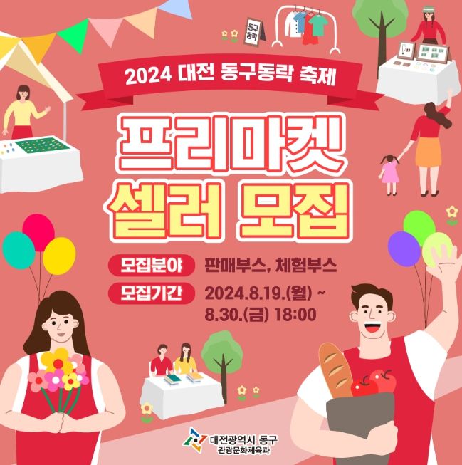 (아름다운교육신문) 대전 동구는 ‘2024 대전 동구동락 축제’ 프리마켓에 참여할 체험 및 판매 부스 셀러를 이달 30일까지 모집한다.