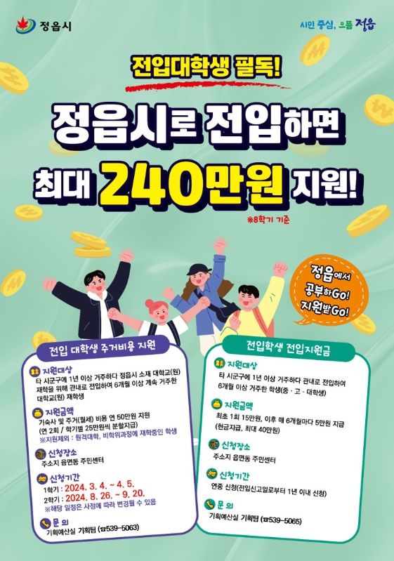(아름다운교육신문) 정읍시는 오는 26일부터 9월 20일까지, 2024년 하반기 전입 대학생 주거비용 지원사업의 접수를 시작한다.