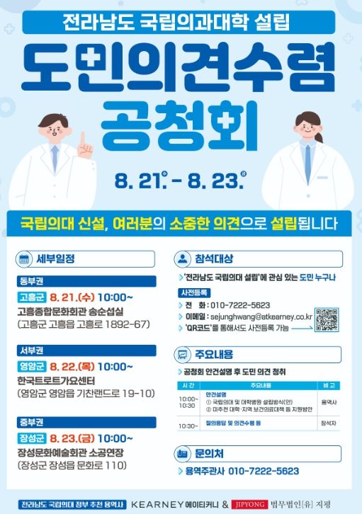 또한 용역사는 전남 의과대학 설립은 전 도민의 건강권과 관련된 지역 최대 현안으로, 다양한 도민 의견수렴을 위해 1차와 지역을 달리한 동부권, 서부권, 중부권으로 나눠 각각 진행된다고 밝혔다.