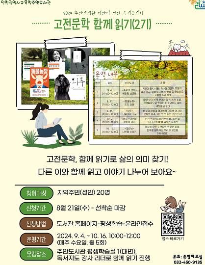 주안도서관 관계자는 “상반기 ‘고전문학 함께 읽기’에 참여하지 못한 분들이나 꾸준히 함께하고 싶은 분들은 이번 기회를 놓치지 말고 신청해 주시길 바란다”며 “독서의 계절 가을에 고전문학 속으로 푹 빠질 수 있는 시간이 되길 희망한다”고 말했다.