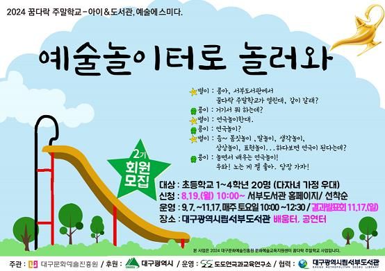 (아름다운교육신문) 대구서부도서관은 8월 19일부터 8월 30일까지 놀이와 연극 활동을 통해 초등학생들의 예술적 감수성과 정서적 안정성을 키워 주고자 꿈다락 주말학교 ‘예술놀이터로 놀러와 2기’ 참가자를 모집한다.