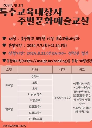 (아름다운교육신문) 울산학생교육문화회관은 특수교육대상자의 문화 예술 감수성을 길러주고자 ‘제3기 특수교육대상자 주말 문화예술교실’을운영한다.