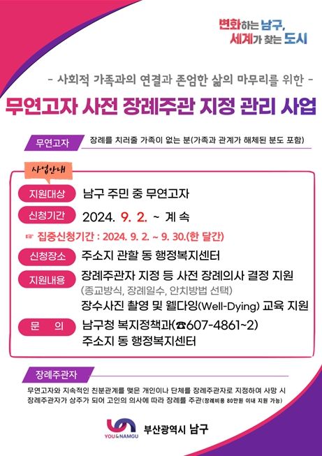 (아름다운교육신문) 부산 남구는 장례를 치러줄 가족이 없는 분들이 생전 사회적 친분이 있는 자와의 연결을 통해 사후존엄성을 확보할 수 있도록 지원하는‘무연고자 사전 장례주관 지정․관리 사업’을 실시한다고 밝혔다.