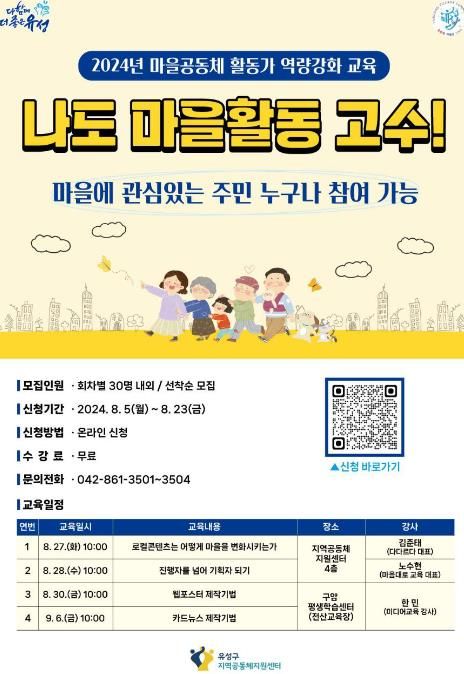 교육은 마을공동체 활동에 관심 있는 주민이라면 누구나 참여할 수 있으며, 8월 25까지 유성구 지역공동체지원센터 홈페이지를 통해 신청할 수 있다.