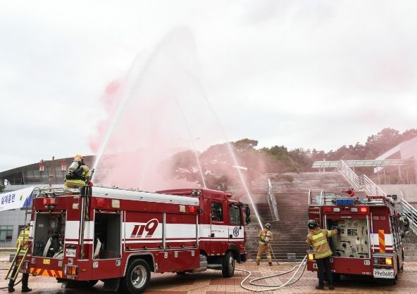 훈련은 정체불명의 테러범에 의한 시민운동장 테러, 화재발생 상황을 가정해 상황전파, 테러진압, 인명구조, 화재진화, 응급복구 등 실전과 같은 상황이 현장감 있게 진행됐다.