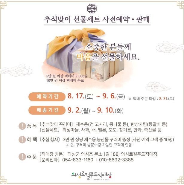 (아름다운교육신문) 의성군은 추석을 맞아 의성로컬푸드직매장에서 지역농가의 안정적인 판로확보와 소비자의 편의 제공을 위하여 8월 17일부터 9월 6일까지(택배주문은 8월 31일까지) 의성산 제수용 농산물과 함께 추석맞이 선물세트를 사전예약 및 판매한다고 밝혔다.