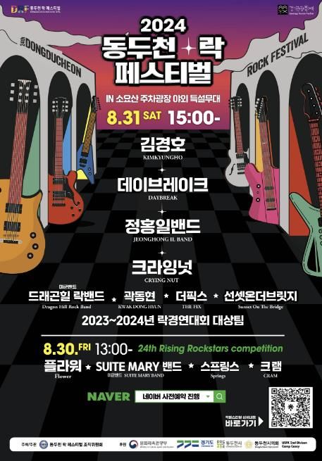 이렇듯 역사 깊고, 국내에서 인정받은 대한민국 최장수 락(Rock) 뮤직 페스티벌이자 락 밴드 등용문인 ‘2024년 제24회 동두천 락 페스티벌’이 8월 30일부터 31일까지 이틀간 열린다. 축제 첫날인 30일(금)은 예선을 뚫고 올라온 락 밴드들의 열띤 경쟁 속에 결선 경연 무대가 펼쳐진다. 더불어 동두천 출신으로 2015년 인기상을 받은 ‘밴드 스프링스’와 2018년 일반부 대상을 수상 후 인기를 얻고 있는 ‘크램’공연이 이어지며, ‘플라워’의 멋진 공연으로 피날레를 장식할 예정이다.