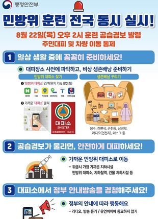 (아름다운교육신문) 전북특별자치도는 22일 오후 2시부터 20분간 전국에서 공습 대비 민방위훈련을 실시한다고 밝혔다.
