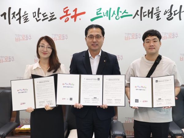 (아름다운교육신문) 대전 동구는 21일 구청장 접견실에서 천동 리더스시티4블럭아파트 전혜연 입주자대표회장(임시)‧대성동 은어송하늘채리버뷰아파트 이진우 입주자대표회장(임시)과 국공립어린이집 설치 및 운영 전반에 관한 업무 협약을 체결했다.