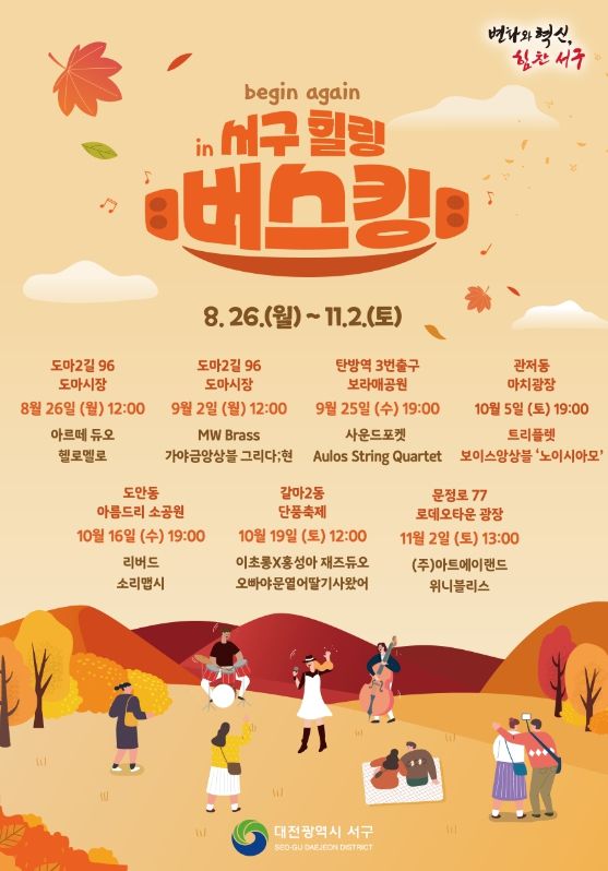 (아름다운교육신문) 대전 서구가 지역 청년 음악인을 발굴하고 지원하는 ‘비긴어게인 in 서구 힐링 버스킹’ 하반기 공연을 개최한다.