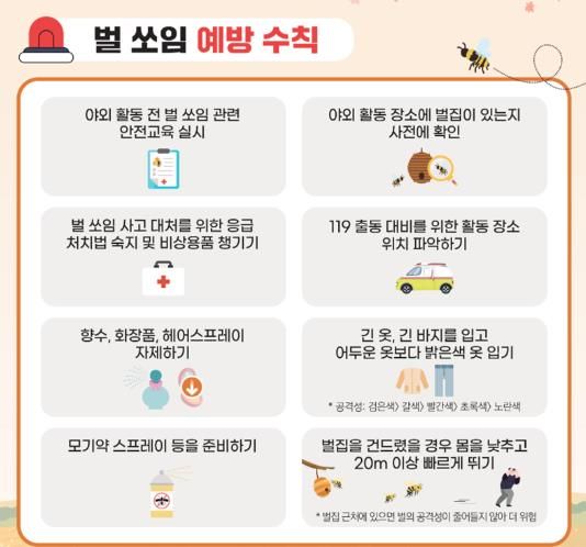 (아름다운교육신문) 순창군은 여름철 산행과 추석 전 벌초, 성묘 등 야외활동이 활발해지면서 벌쏘임 사고가 증가함에 따라, 벌쏘임 예방 수칙과 응급처치 요령을 적극 홍보하고나섰다.