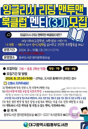 (아름다운교육신문) 대구동부도서관은 8월 21일부터 오전 9시부터 어린이들의 올바른 영어 독서 습관 형성을 위한 맞춤형 영어그림책 멘토링 프로그램 ‘잉글리시 리딩 맨투맨 북클럽’3기 멘티를 동부도서관 누리집을 통해 모집한다.