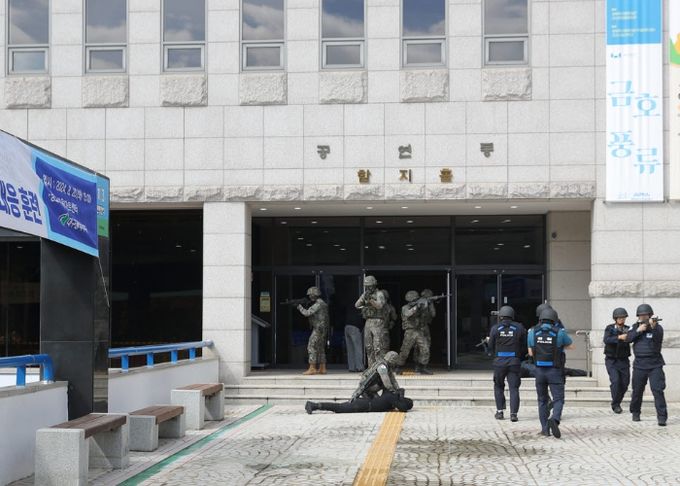 이날 훈련은 적 테러범 2명이 어울아트센터 함지홀에 침투하여 인질극과 총격전을 벌이는 상황으로 전개됐다.