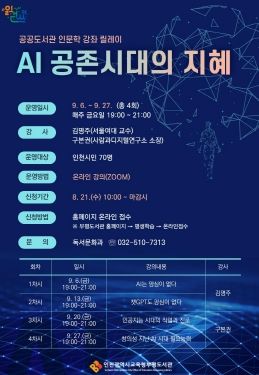 (아름다운교육신문) 인천광역시교육청부평도서관에서는 읽걷쓰 사업의 일환으로 9월 6일부터 27일까지 매주 금요일 2024년 인문학 강좌 릴레이 'AI 공존시대의 지혜'를 총 4회 운영한다고 밝혔다.