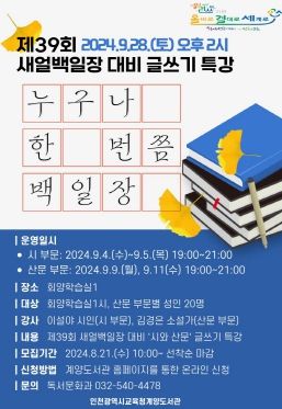 (아름다운교육신문) 인천광역시교육청계양도서관은 9월 4일부터 9월 11일까지 시 부문 2회, 산문 부문 2회로 총 4회에 걸쳐 제39회 새얼백일장 대비 글쓰기 특강 '누구나 한 번쯤, 백일장' 프로그램을 운영한다.