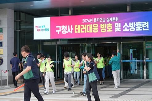 (아름다운교육신문) 부산 남구는 8월 20일 2024 을지연습 실제훈련의 일환으로 ‘구청사 테러 대응 방호 및 소방훈련’을 실시했다.