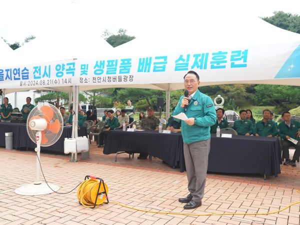 (아름다운교육신문) 천안시는 21일 시청 버들광장에서 2024년 을지연습 실제훈련인 ‘전시 양곡·생필품 배급’을 실시했다.