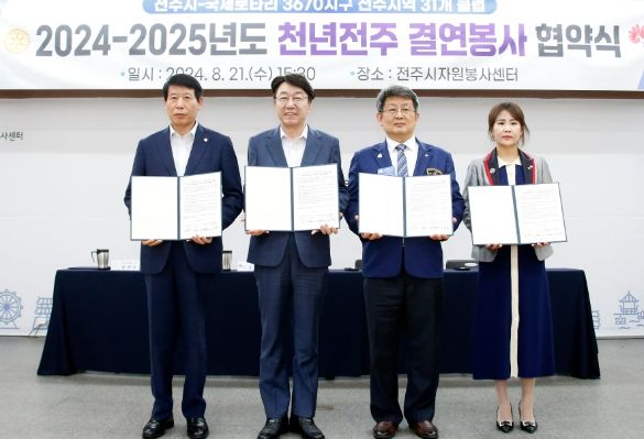 전주시와 국제로타리 3670지구는 21일 전주시자원봉사센터에서 우범기 전주시장과 남관우 전주시의회 의장, 이지원 국제로타리3670지구 총재, 이대성 로타리 재전협의회 의장, 전주지역 31개 로타리클럽 관계자, 동 주민센터 관계자 등 70여 명이 참석한 가운데 ‘2024-2025년도 천년전주 결연봉사 협약식’을 가졌다.