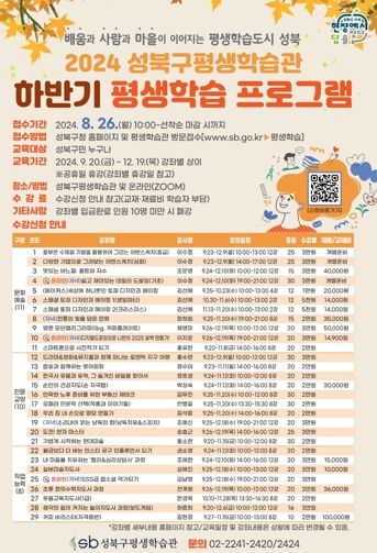 이승로 성북구청장은 “이번 하반기 평생학습 프로그램에 많은 관심과 참여 부탁드린다”라며 “다양한 분야의 프로그램을 통해 역량을 강화하고, 새로운 도전을 위한 발판을 마련하길 바란다”라고 말했다.