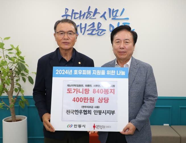 (아름다운교육신문) (사)전국한우협회 안동시지부는 지난 8월 21일에 임동면, 와룡면, 서후면, 예안면 4개면 재난피해 주민에게 도가니탕 840봉지(400만 원 상당)를 기부했다.