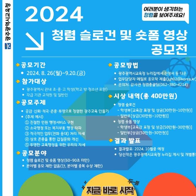 (아름다운교육신문) 광주시교육청은 청렴한 광주교육에 대한 인식을 제고하고 청렴 문화를 확산시키기 위해 ‘2024 광주교육 청렴 콘텐츠 공모전’을 개최한다.