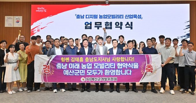김태흠 지사는 22일 도청 대회의실에서 최재구 예산군수, 김정겸 충남대 총장, 류석현 한국기계연구원 원장, 신재호 LS엠트론 대표이사 등과 충남 디지털 농업 모빌리티 산업 육성을 위한 업무협약(MOU)을 체결했다.