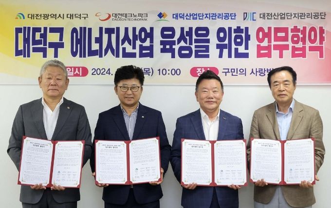 대덕구는 22일 구청 구민의 사랑방에서 대전테크노파크, 대덕산업단지관리공단, 대전산업단지관리공단과 에너지산업 육성을 위한 업무협약을 맺었다고 밝혔다.