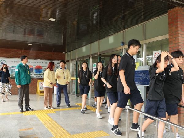 (아름다운교육신문) 충주시는 22일, 충주 중앙중학교에서 학생과 교직원 등 400여 명이 참여한 공습 대비 민방위 대피훈련을 실시했다.