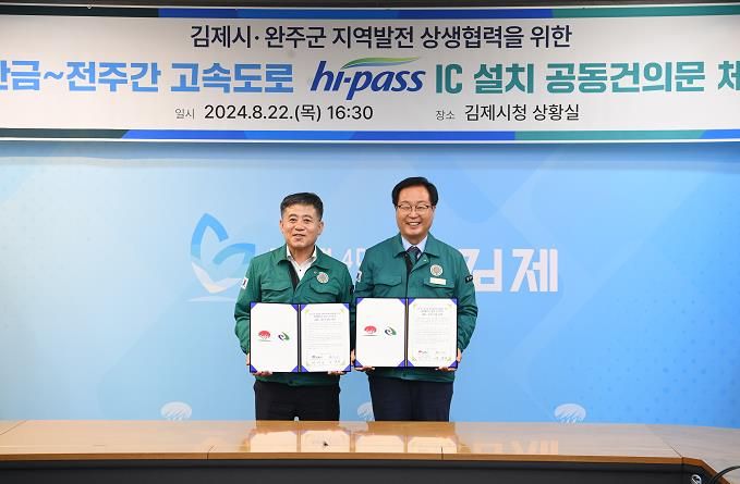 (아름다운교육신문) 완주군과 김제시가 지역발전 상생협력사업으로 새만금-전주간 고속도로 하이패스IC(이서면과 용지면 경계) 설치를 위해 손을 맞잡았다.