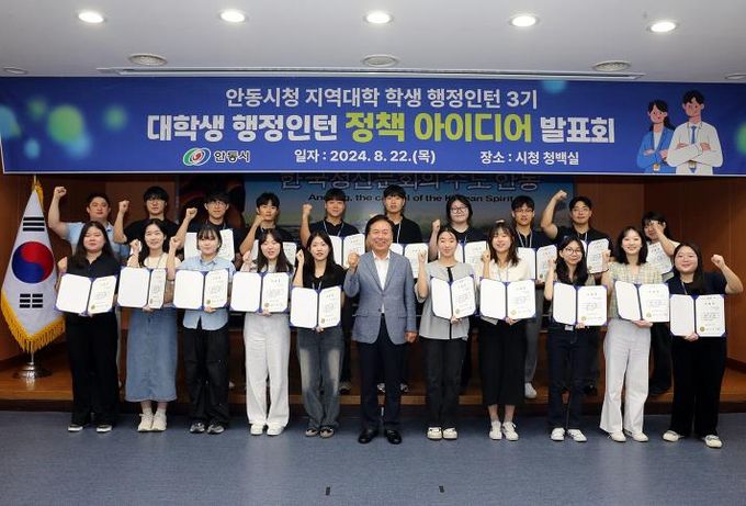 이날 행사는 대학생 행정인턴들이 업무를 수행하며 느낀 점과 안동시 발전을 위한 참신한 아이디어를 발표하고, 행정인턴 수료증을 전달하는 순서로 진행됐다.