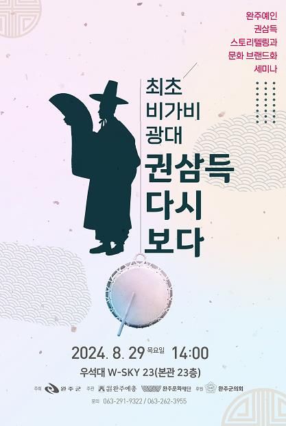 (아름다운교육신문) 완주군과 완주예총, 완주문화재단이 함께‘최초 비가비 광대 권삼득 다시 보다’세미나를 오는 29일 오후 2시, 우석대학교 본관 23층 완주․우석전망대에서 개최한다.