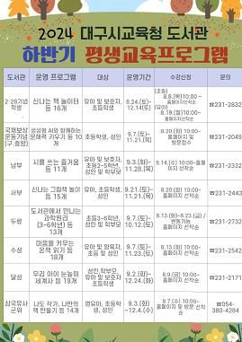 (아름다운교육신문) 대구시립도서관(대구시교육청 산하 8개 공공도서관)이 8월 말부터 지역민들의 지성을 키우고 감성을 깨우는 ‘2024년 하반기 평생교육 프로그램’을 운영한다.