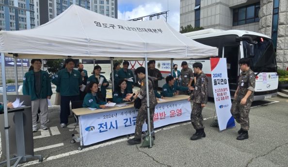 (아름다운교육신문) 부산시 영도구는 지난 8월 22일 구청 전면 주차장에서 을지연습과 연계하여 전시 중상자 대량 발생 대비 혈액 확보를 위한 전시 긴급 채혈훈련을 실시했다.