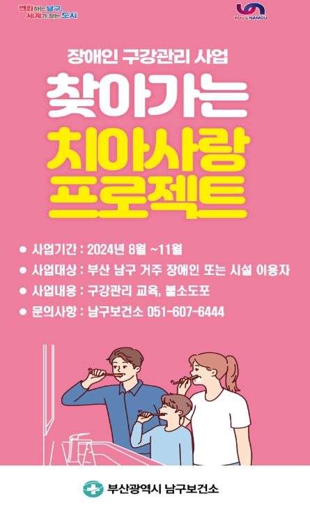 (아름다운교육신문) 부산 남구는 8월부터 11월까지 장애인의 건강한 구강관리를 위한 '찾아가는 치아사랑 프로젝트'를 운영한다.