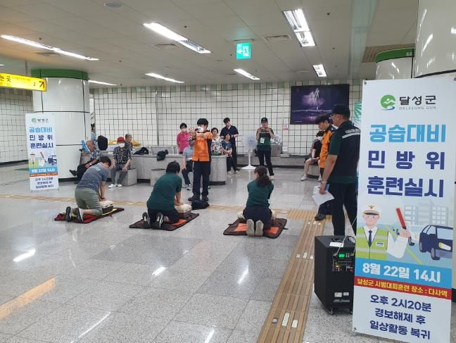 (아름다운교육신문) 달성군은 을지연습 기간 마지막 날인 22일 목요일 오후 2시에 대구도시철도 2호선 다사역 이용객을 대상으로 적 공습상황을 가정해 공습대비 민방위 대피훈련을 실시했다.