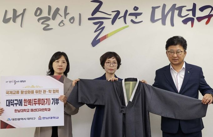 대덕구는 23일 한남대 패션디자인학과로부터 두루마기 한복을 전달받았다고 밝혔다. 이번 한복 기탁은 전통문화를 계승하고 지역사회의 문화적 자산을 널리 알리고자 마련됐다.